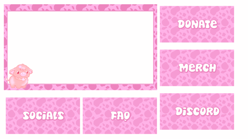 Upgrade your stream with this pink cow stream overlay pack, designed for creators who want a cohesive, eye-catching look. This set is perfect for streamers who love pink, cows, farm life, simple styles and want their stream to feel polished and on-brand.